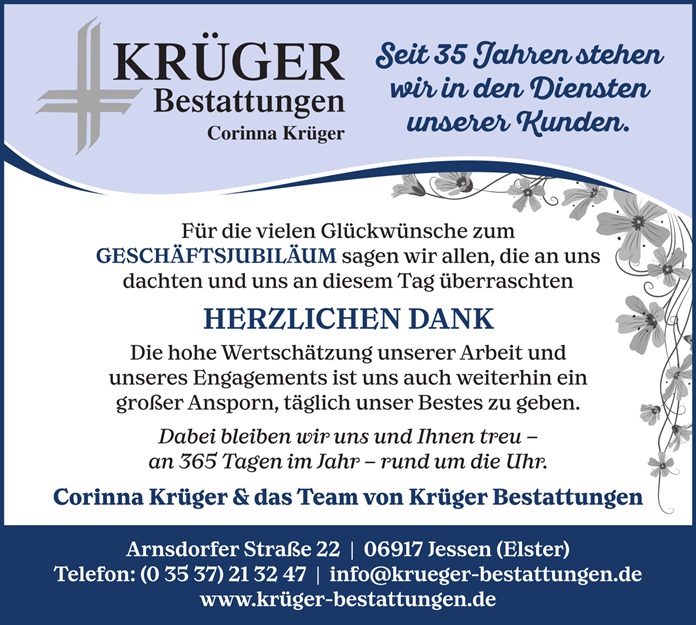 35 Jahre Krüger-Bestattungen - KRÜGER Bestattungen Tel.: 03537 213247 - Jessen - Wittenberg - Annaburg